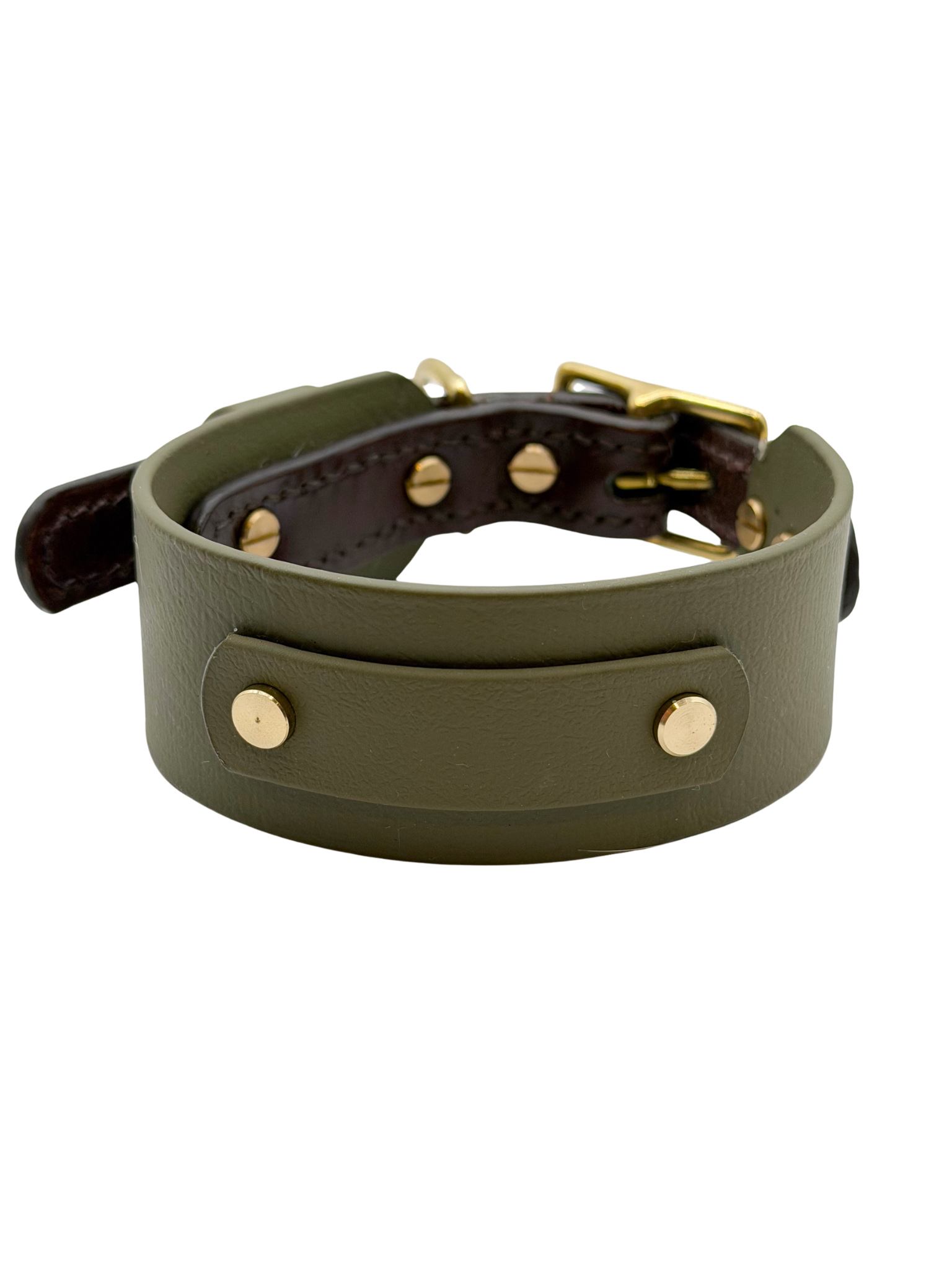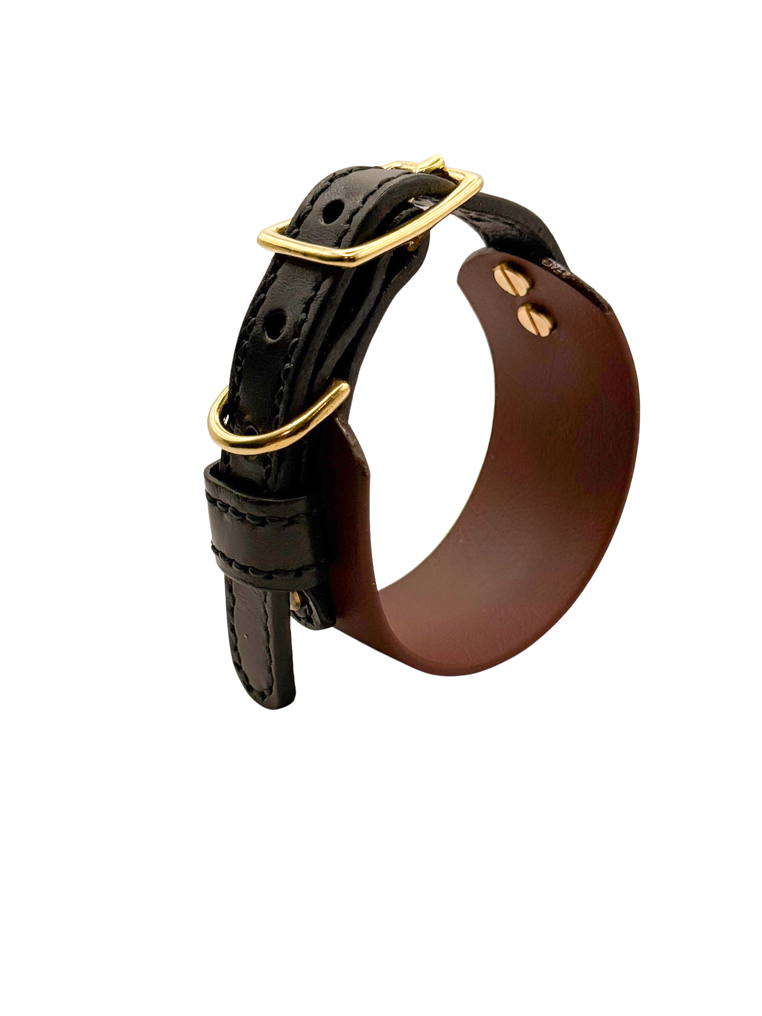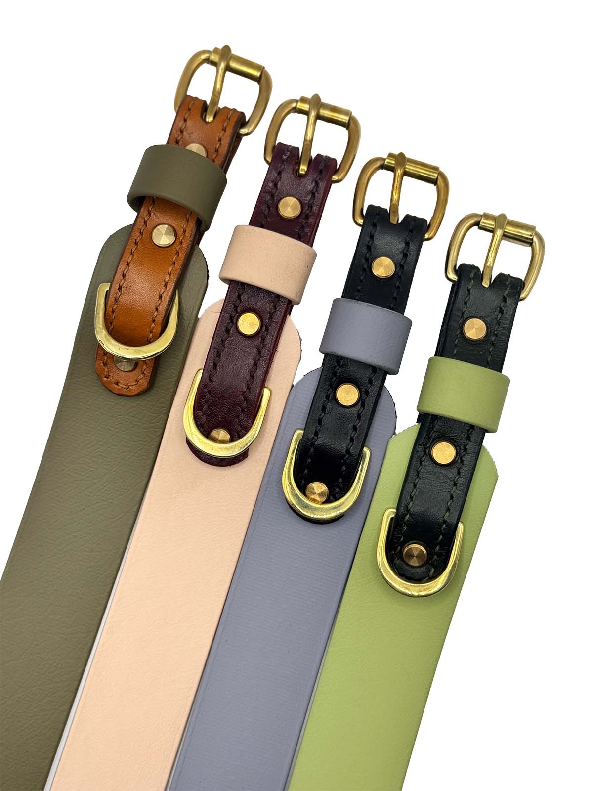 Elementy ze skóry są ręcznie wycinane, farbowane i wykończone. Każda obroża jest unikatowa a skóra z czasem nabiera szlachetnej patyny, podkreślając charakter produktu.